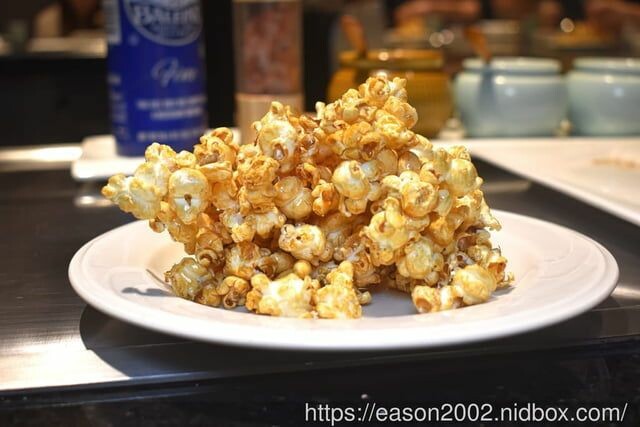 利用鐵板現爆的焦糖爆米花,酥脆可口。