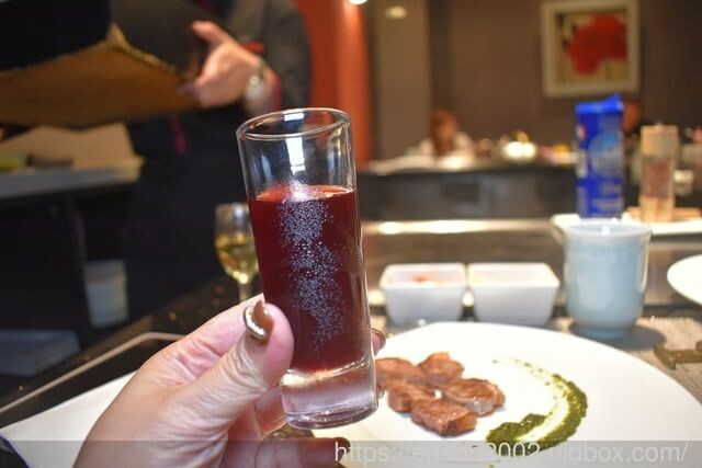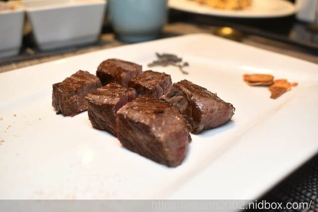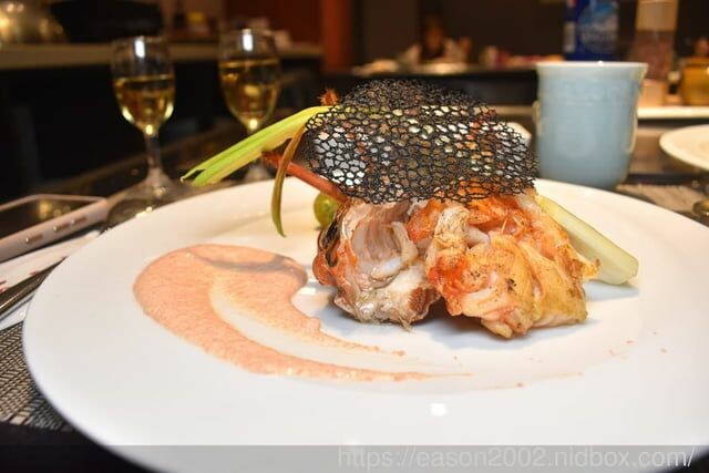 餐間會附上「員山二湖鳳梨果醋」,去油解膩之外,同時將味蕾update一下,準備迎接今天的主角,創意龍蝦料理以及美國極黑金牌和牛肋眼。