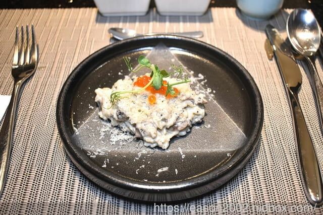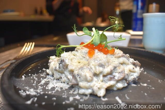 精心嚴選宜蘭五結在地小農自產的夢田越光米,所製成的鮭魚卵松露燉飯,米粒分明,充斥著黑松露特殊香氣與奶香,最上層撒上現刨帕瑪森起司,接著以鮭魚卵點綴,增添口感上的層次感。