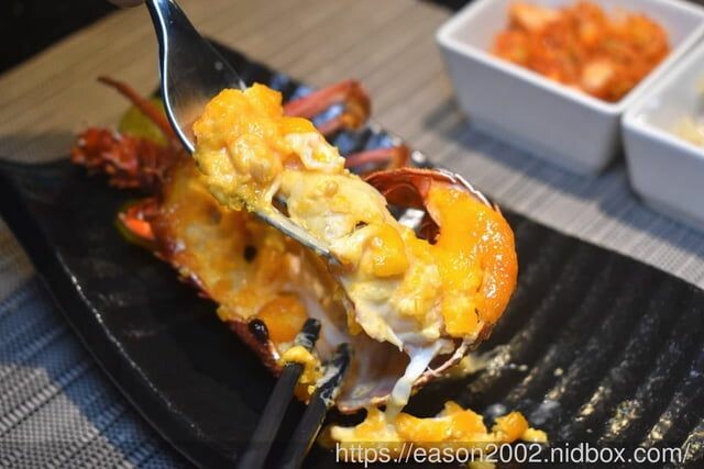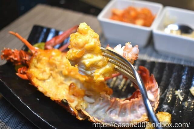 以飛魚卵、海膽膏、蛋黃醬 焗烤過後的本地青殼龍蝦,帶著焗烤後的特殊香鹹風味,龍蝦肉肥美彈牙,值得細味品嚐。