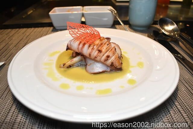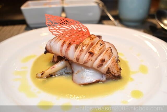 特別將本地青殼龍蝦的蝦肉取出,以最原始的料理方式烹調,鐵板乾煎後的龍蝦肉,帶著鐵板香煎的特殊香氣,輕沾明太子奶醬,別有風情,墨魚蕾絲不僅是裝飾品,也可以搭配明太子奶醬一同品嚐。
