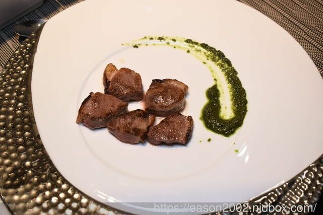 來到宜蘭怎麼可以少了櫻桃鴨呢!?香煎宜蘭櫻桃鴨胸,佐上主廚現場以鐵板精心熬製的蘿勒青醬,吃起來有點類似牛排的口感。