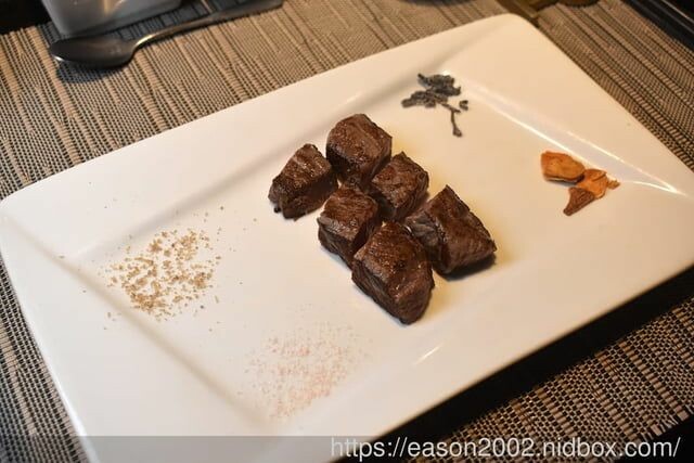 嚴選美國極黑和牛肋眼最高等級(金牌),肉質軟嫩多汁,特別附上四種不同風味鹽,可以依照個人喜好搭配,分別為 煙燻海鹽、昆布鹽、芥末胡椒鹽與蒜片。
