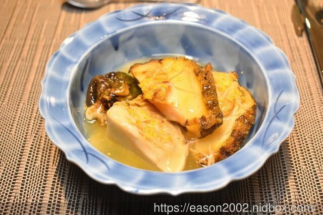 以主廚精心熬製的金湯瑤柱醬為基底,襯托出東北角放野鮑魚的新鮮滋味,湯底喝得到老母雞干貝絲以及浸泡威士忌後烘烤磨成粉狀的鹹蛋黃,新鮮活鮑魚的口感Q彈,吃完嘴裡充滿令人滿足的海味,底層吸飽滿湯汁的百靈菇,將精華完美呈現。