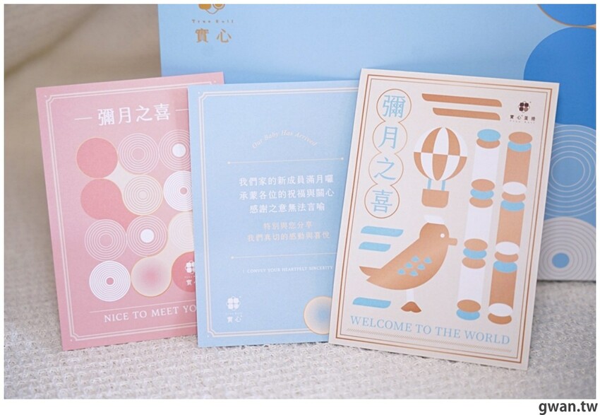只要訂購彌月禮盒,不限盒數皆贈送彌月小卡!未滿40盒贈送的公版小卡有三種顏色款式,可任選一款,內容文字不能修改
