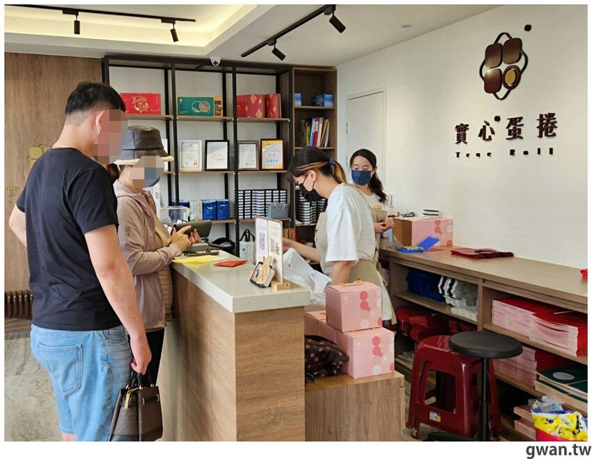 住在台中的朋友可以前往實心蛋捲門市索取彌月試吃,不用事先預約,只要準備好媽媽/寶寶手冊就能直接折抵100元!這天前往門市時,剛好遇到其他客人正在訂購彌月禮盒呢