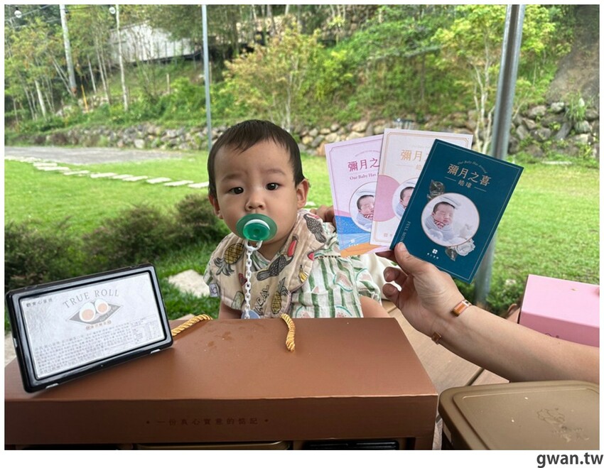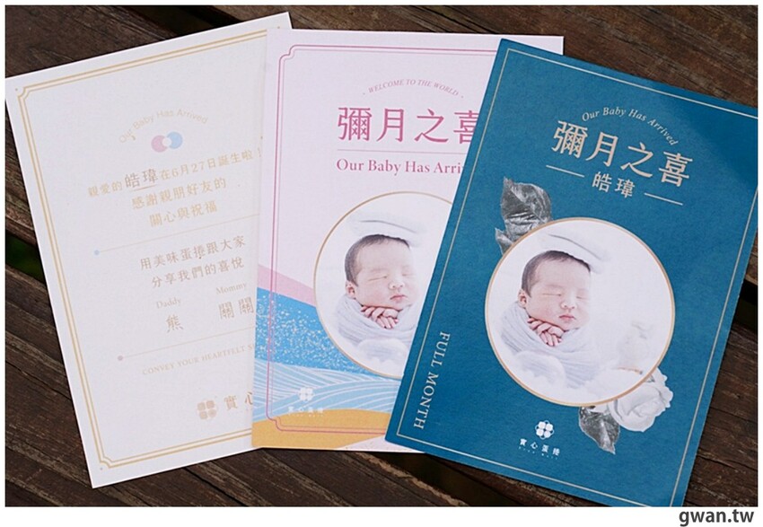 一般彌月卡通常是名片大小,但實心蛋捲的彌月卡做成明信片大小,不管是照片或彌月資訊,都能蠻清楚地呈現