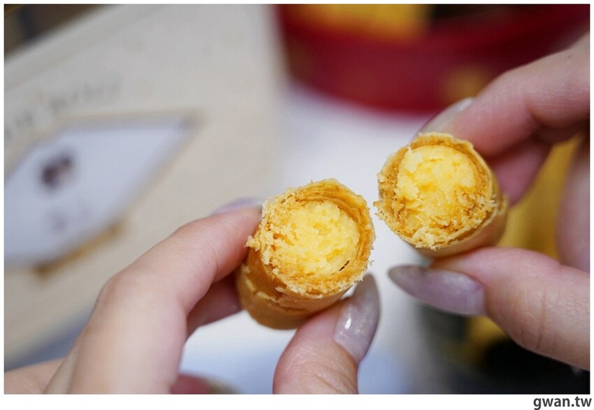 喜歡包餡蛋捲的朋友,實心蛋捲注入2倍飽滿的內餡,每一口都能吃到香濃餡料和薄酥餅皮,雖然皮薄但厚度很扎實,咬起來是很有層次感的