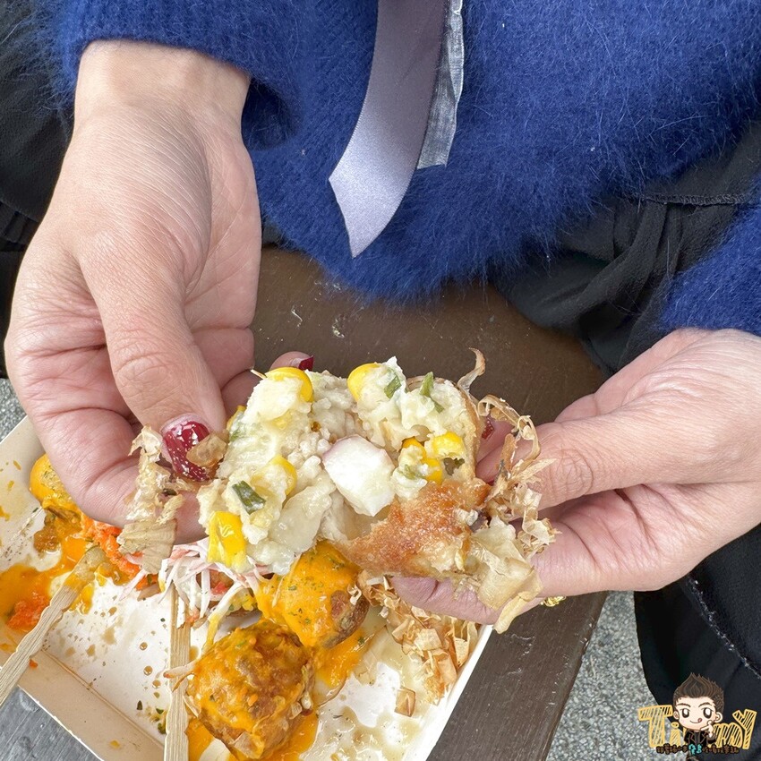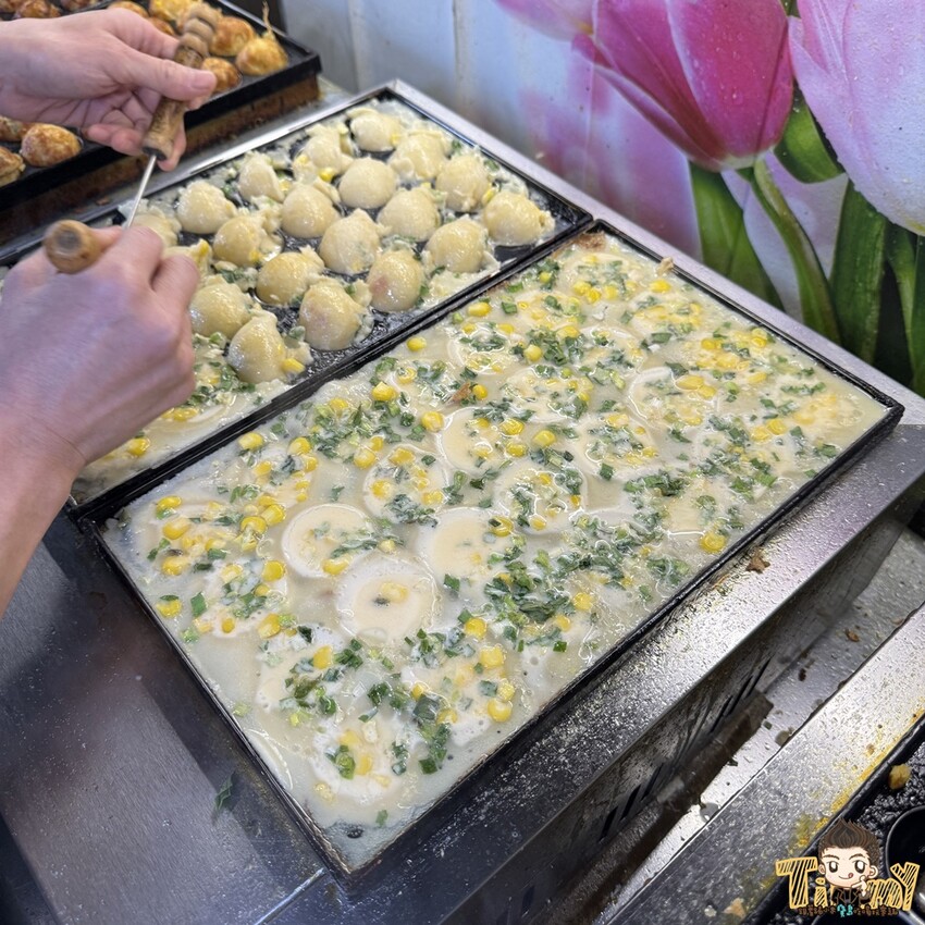 老闆娘可媽製作的章魚小丸子,內餡跟市面上的不太一樣,她特別用玉米取代高麗菜