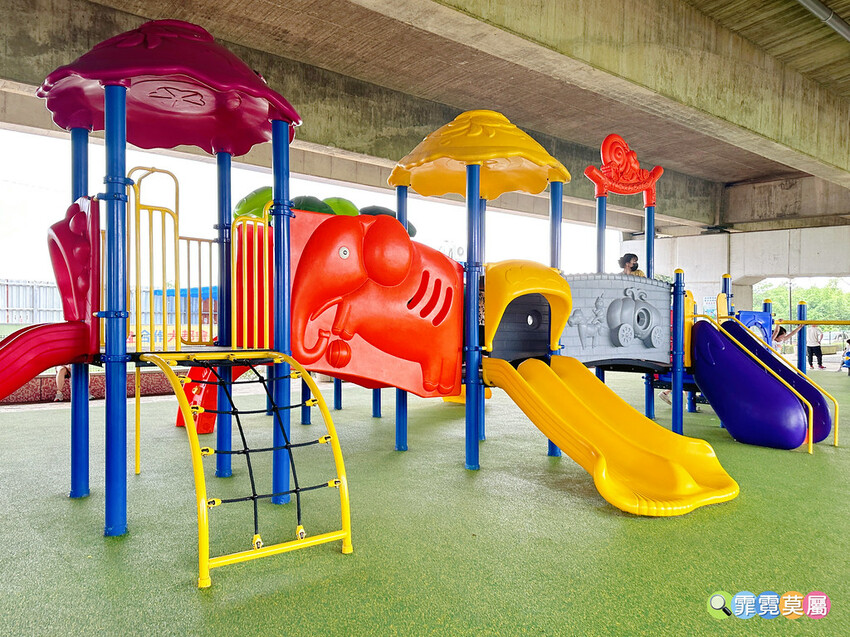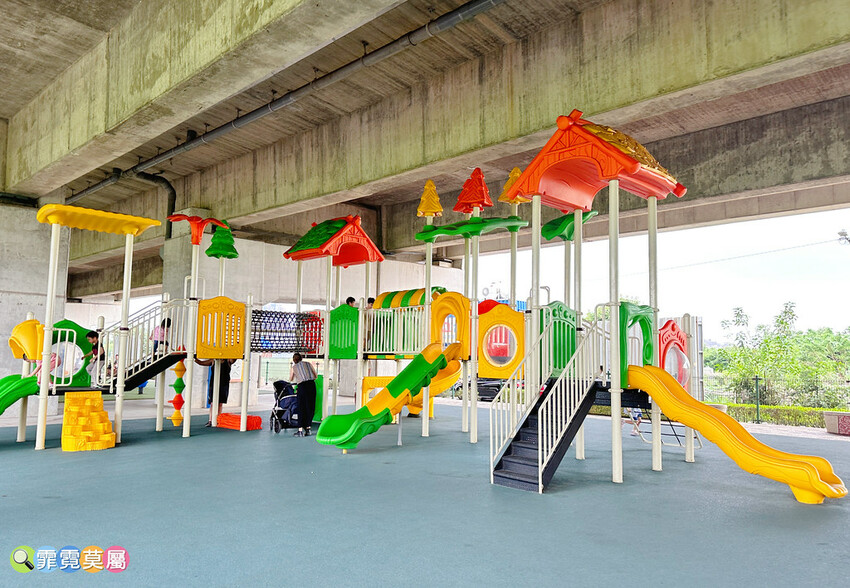 超多大型溜滑梯遊具的橋下公園,以罐頭遊具為主。基本該有的遊具這裡通通有,溜滑梯、盪鞦韆、攀爬設施、蹺蹺板和搖搖馬等,遊戲場很大所以人潮很分散玩樂都不用排隊,這點真的超棒!