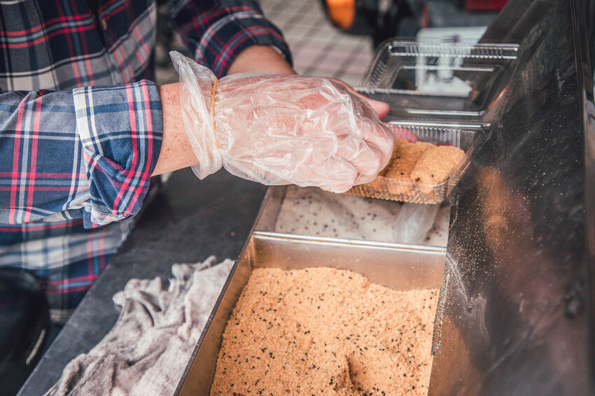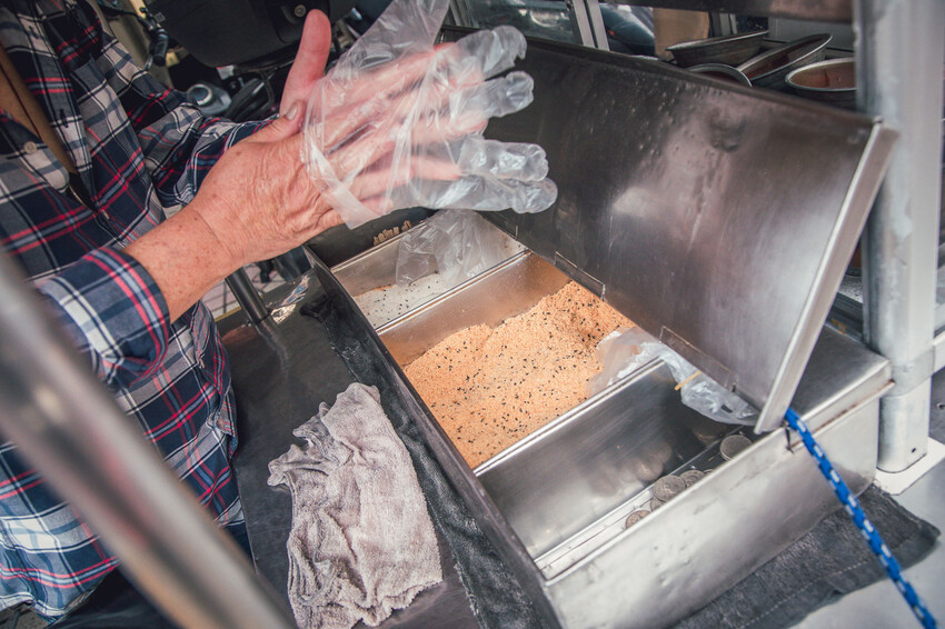 點了之後,阿伯才會打開他的鐵盒開始包麻糬,鐵盒裡裝的是糖粉跟花生粉,阿伯會先戴上手套,拿起一片麻糬包進糖粉後再丟到花生粉裡,阿伯包麻糬的動作超快,一包一握,手法挺像在握壽司的