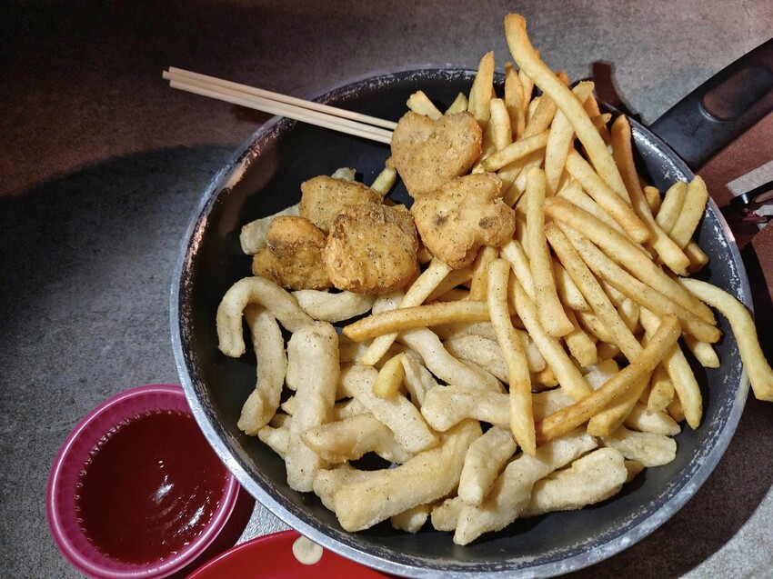 炸物拼盤包括薯條,雞塊和甜不辣,我們一致認為甜不辣最好吃,點來當聊天的配菜很可以