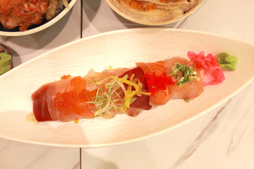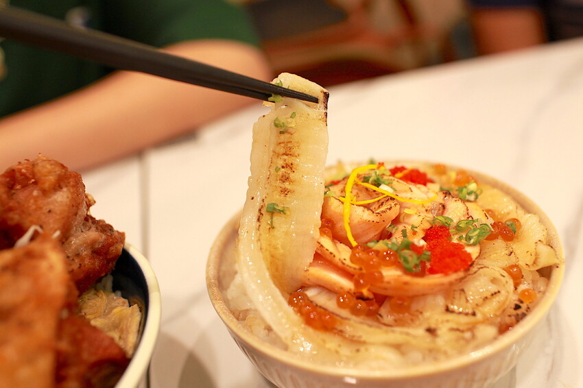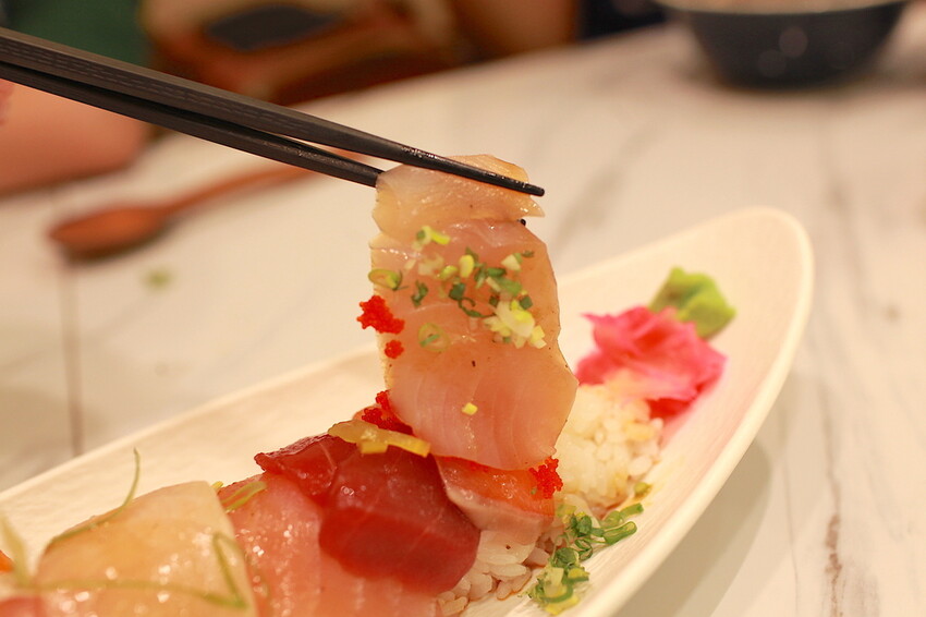 生魚丼端上來已經淋上醬油調味,所以從外觀無法辨認什麼魚種魚肉,因此僅能從口味初步來辨認與介紹。