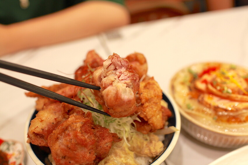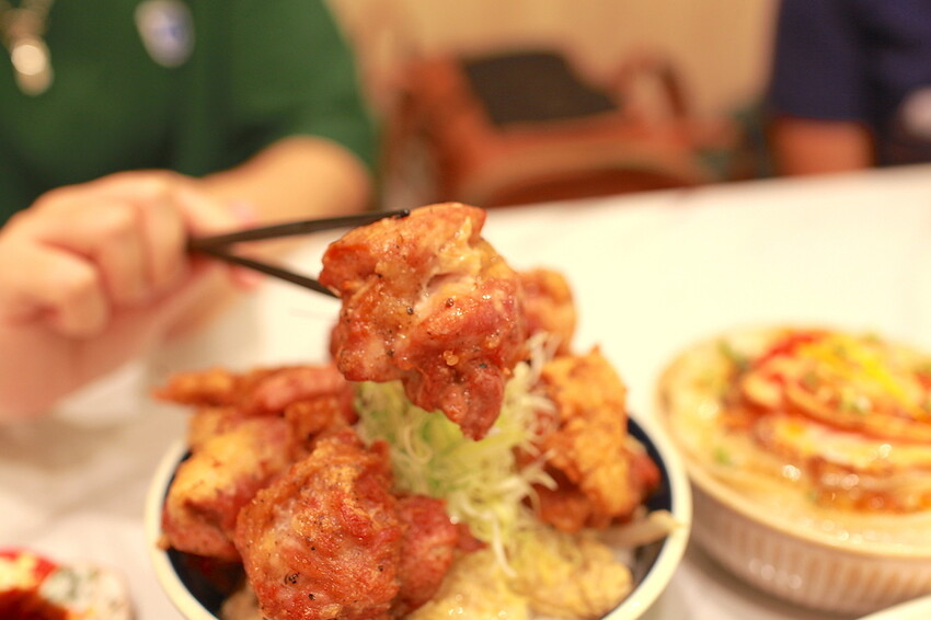 這碗唐揚雞裡面有6球炸雞腿肉,這碗丼飯份量較多足夠個人吃得飽。