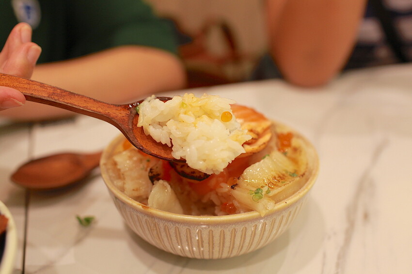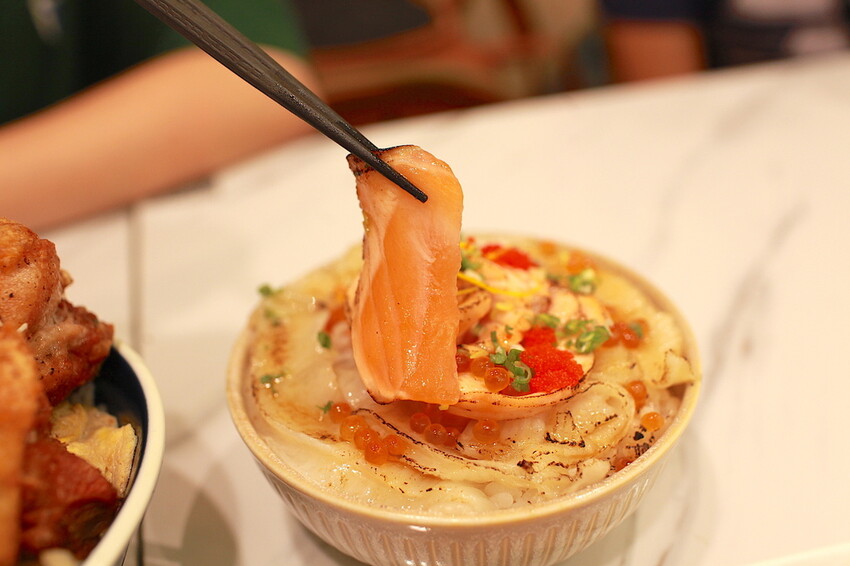 這碗炙燒鮭比丼飯令人無法想像的小碗,底部是壽司米,表面是炙燒鮭魚跟比目魚,鮭魚跟比目魚份量足做成玫瑰花狀真美觀。