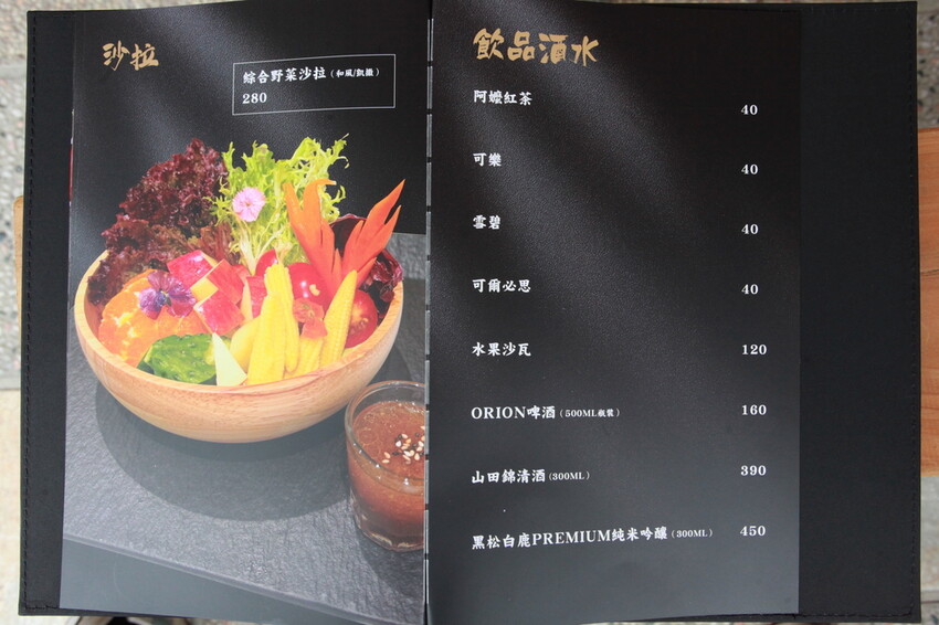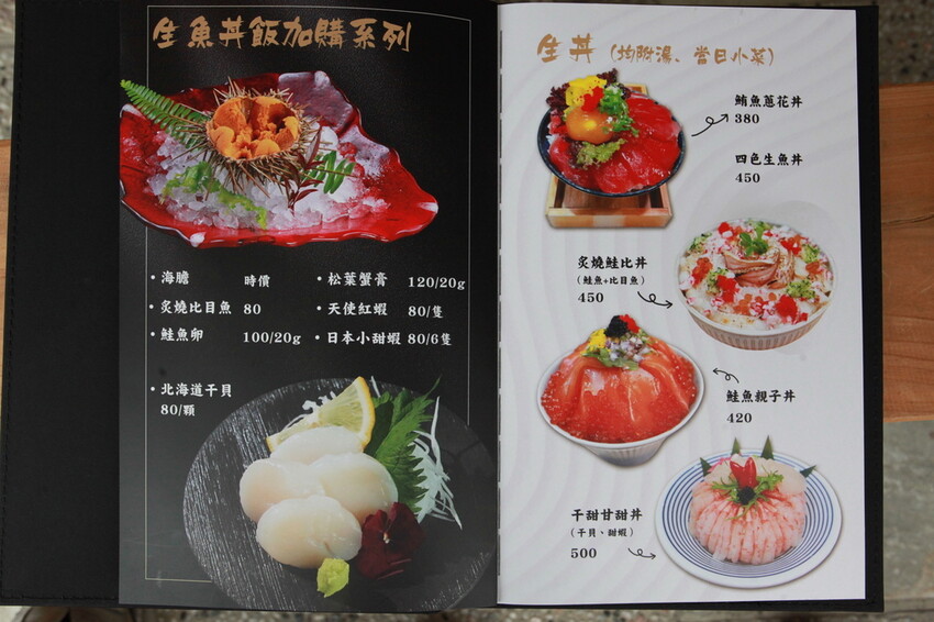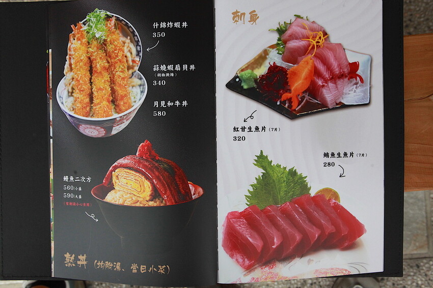 這張正反面菜單供客人點餐參考,菜單品項很多主要有生丼類、熟丼類、手卷類沙拉類、握壽司類、小食類、刺身類、炸物類、烤物類及飲品酒水類,每人低消是一份丼飯或是一份壽司。