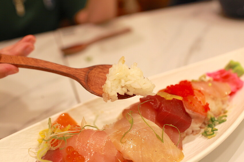 老實講這四色丼擺盤很獨特超有創意,把壽司米做底部再把生魚鋪在表面,食材作法都沒有問題只是份量超少的。