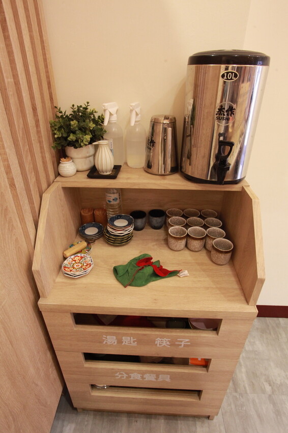靠窗處放置櫥櫃有餐具份、佐料及茶水供自行使用。