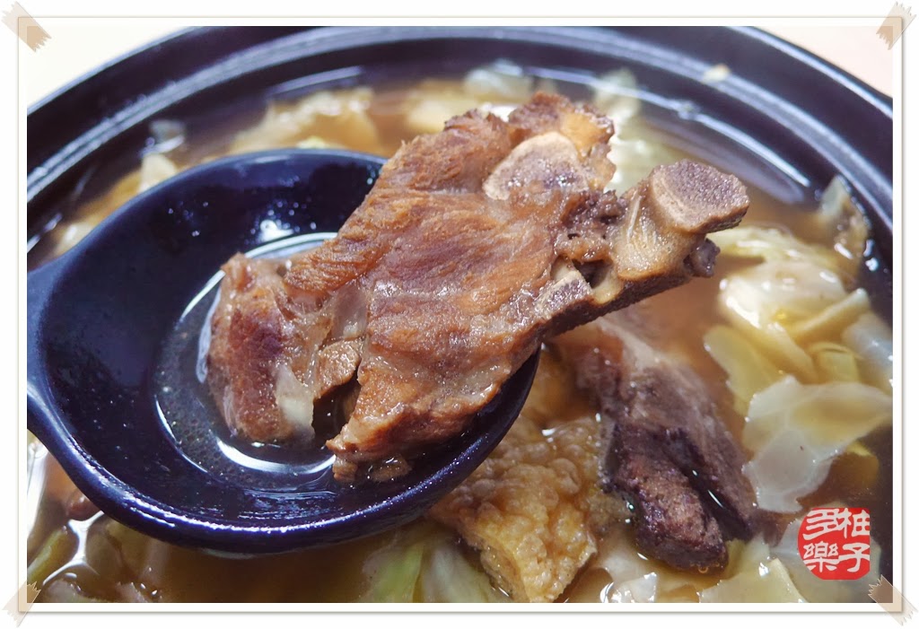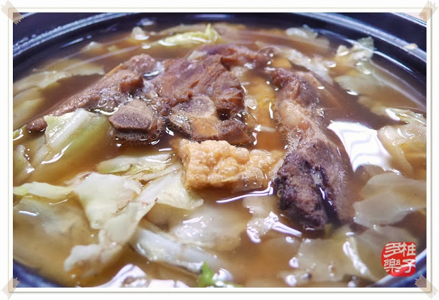 肉骨茶是以竹籃包覆的小砂鍋盛裝,保溫效果十足。肉骨、豆皮、高麗菜裝滿滿,湯頭喝來很清爽,只是少了肉骨茶獨有的濃厚中藥味兒。(就當台版肉骨茶喝吧!)