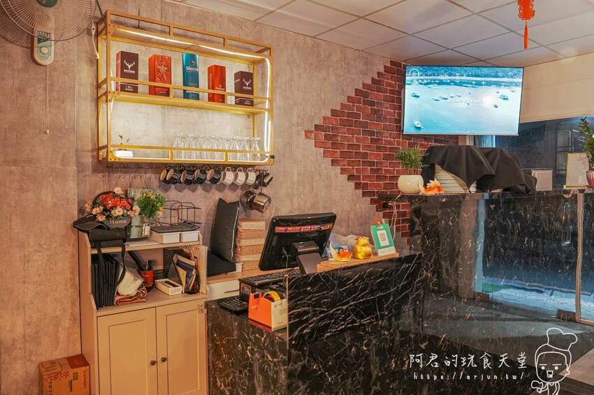櫃台區擺放了招財貓和金魚造型的擺件,增添了些許趣味。