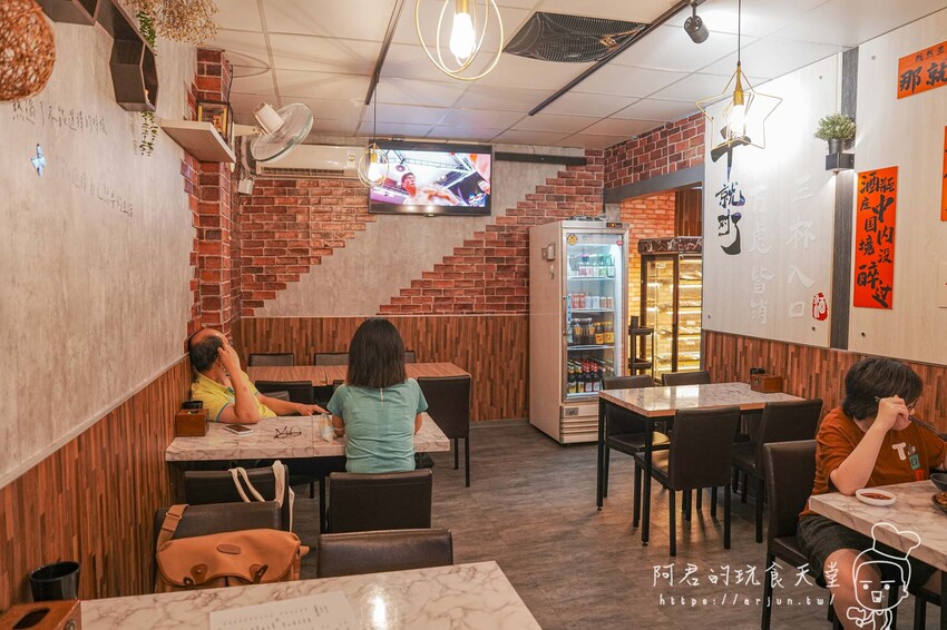 進入店內,牆面貼上了紅磚壁紙,運用了溫暖的木質色調和工業風,創造出既現代又不失溫馨的環境。