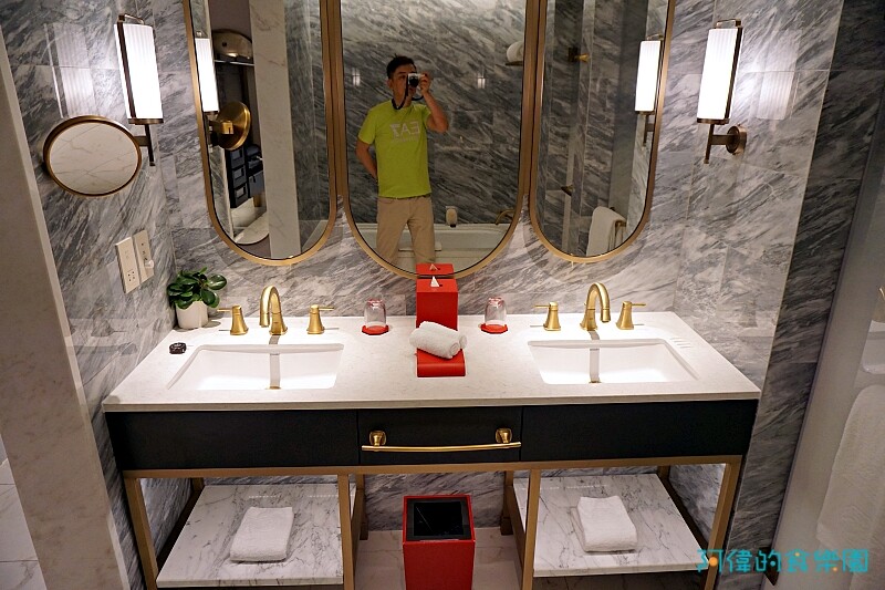 兩個洗手檯,水龍頭是低調奢華的霧金。