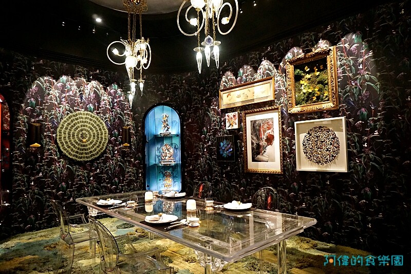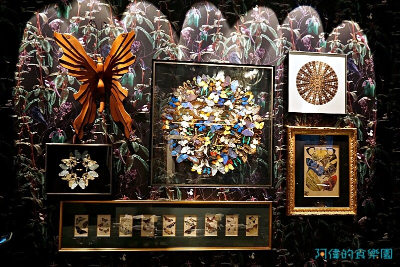 我們順便參觀其它幾間不同風格的包廂,這間是叢林風,地毯像是森林裡的草地,牆上有許多蝴蝶標本。