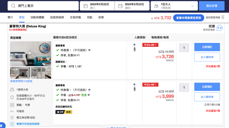 大家看,我以同樣週三的住宿日期去搜,發現含早餐才3999NT.實在很便宜又划算!