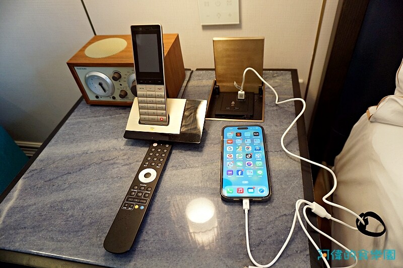 這裡很貼心的是每間房裡都有準備充電線,而且有不同的接頭,無論你是不是用iPhone都可以充,床邊小桌上就有充電孔。