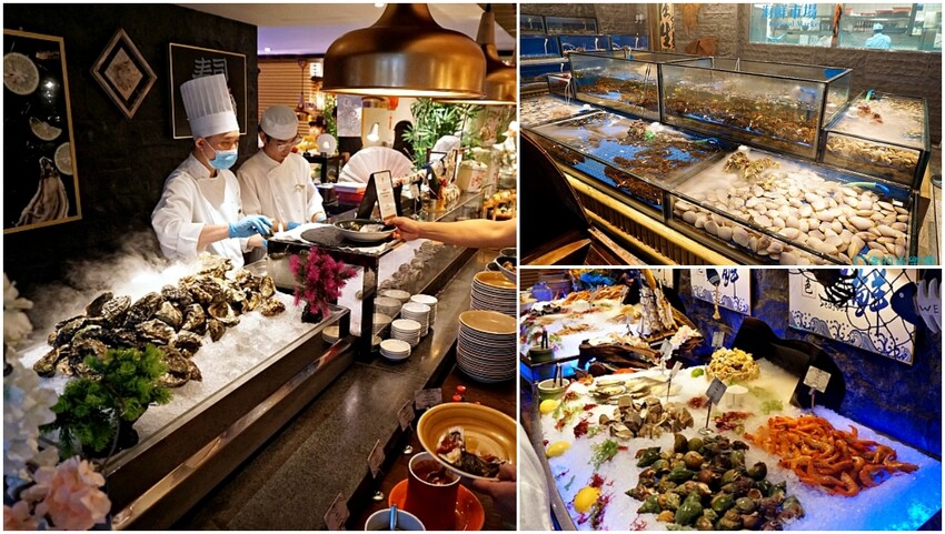 一進門就看到幾個大水槽,裡面都養著許多龍蝦、螃蟹,再來就是餐檯上的大生蠔等海鮮。