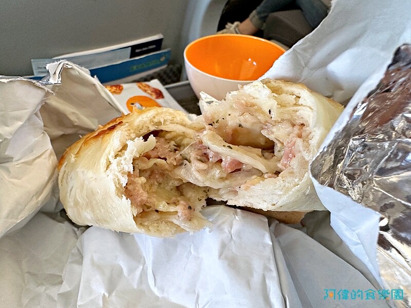 裡面是起司火腿餡,還算蠻香的,但因為上機前已在機場吃過,所以只咬了兩口,畢竟到了澳門之後有更多美食要吃,現在可不能吃太飽啊!