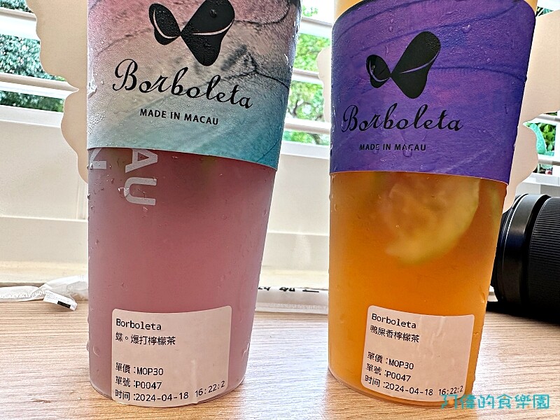 左邊是「蝶 爆打檸檬茶」蝶豆花原本是藍色的,遇到檸檬汁的酸就會變成紫色。