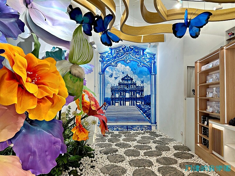 店內以大朵假花為裝飾,最裡面白牆上有一幅大三巴的瓷磚畫。