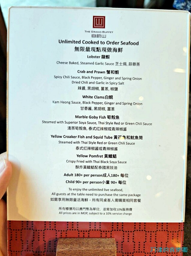 自助山”晚餐限定”每位成人加180MOP(約台幣720)就有「無限量現點現做海鮮」。