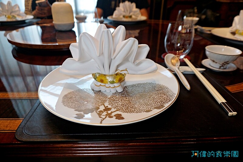 很美有質感的餐具,餐盤上也是菊花,跟那幅牆上的蘇繡相呼應。