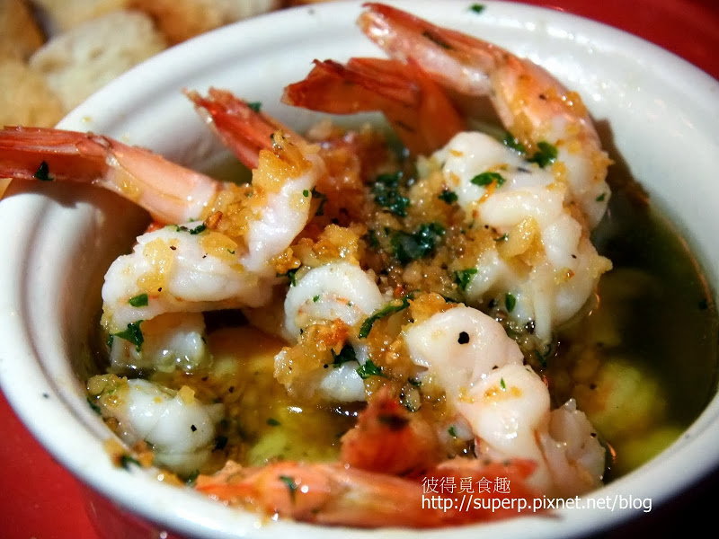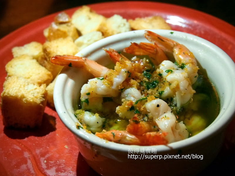 義大利蒜蝦$250(蝦仁泡在裡面有蒜酥,九層塔葉末的橄欖油內。這油蒜香十足,跟蝦超搭配。如果跟旁邊的烤麵包丁一起吃也很棒,推!)