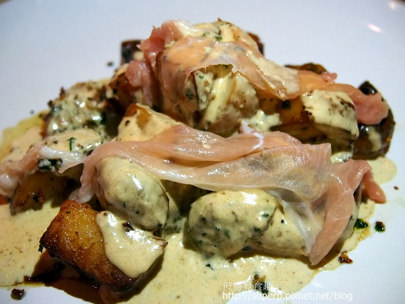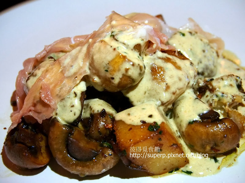 生火腿法式炒蘑菇$300(炒蘑菇很不錯,不過醬料跟鵝肝醬雞腿好像有重複。搭配生火腿,增加了些許的鹹味。其實算好吃的,推!)