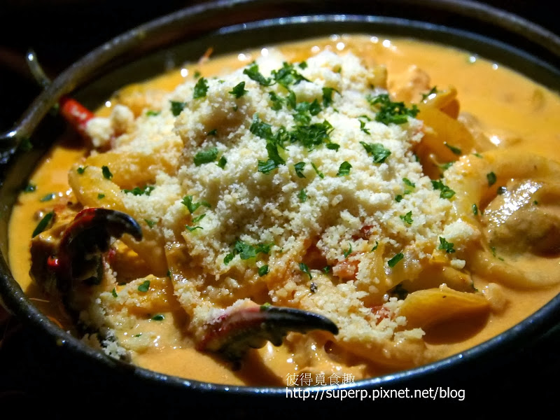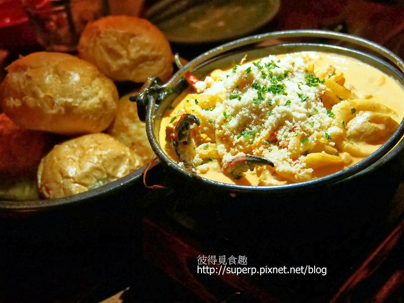 義式海鮮鍋$450(這是這邊的招牌菜之一。奶味十足,看起來有加鮮奶油來讓湯頭濃稠,然後上面又灑了起司粉。裡面有螃蟹,花枝,淡菜那類的海鮮,料多味美。海鮮的味道有被濃縮的感覺。拿來沾麵包是絕配!大推!很好吃,但感覺這鍋熱量超高)