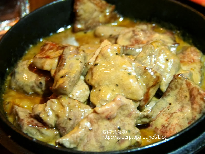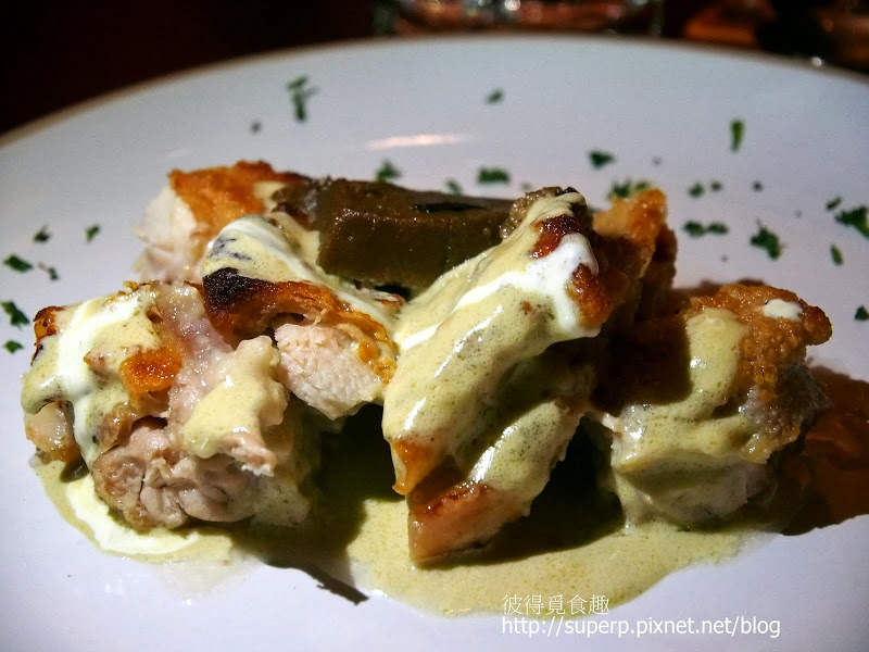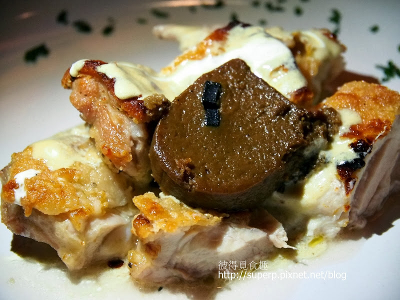 鵝肝醬雞腿$250(雞腿排煎的酥香,佐了類似奶油醬,上面搭配鵝肝醬。非常特別的組合。個人很喜歡加了鵝肝醬一起吃的雞腿,濃郁可口,大推!)