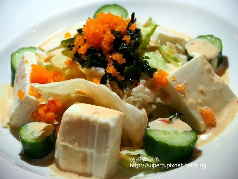 豆瓣醬豆腐沙拉$180(不太好形容這味道。雖然有豆瓣醬,但其實不辣,只有微微的鹹香。搭配清爽的豆腐,以及蝦卵跟海帶芽。看似詭異但其實吃起來並不突兀,推!)