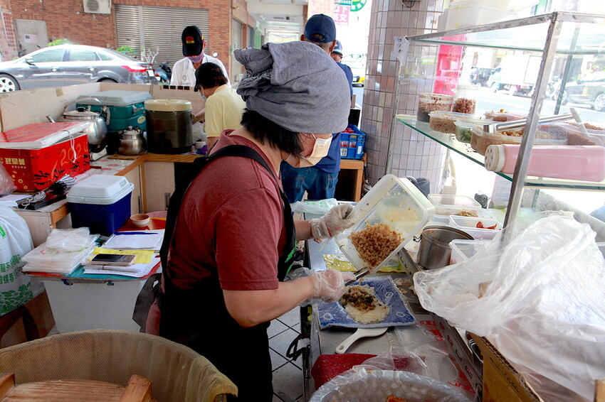 小高在旁邊觀看老闆娘製作飯糰過程,這鹹蛋是使用一整顆的份量真足夠,飽滿飯糰表面使用鹹鴨蛋來做辨認。