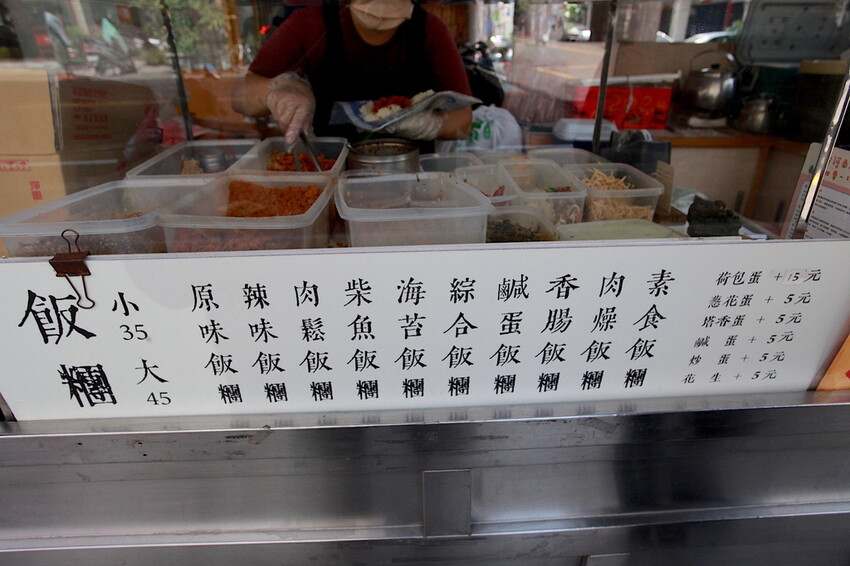 攤位前有貼上菜單供顧客點餐參考,目前飯糰總共有10口味可挑選,飯糰定價小粒35元與大粒45元,想增加配料也有標價供挑選。