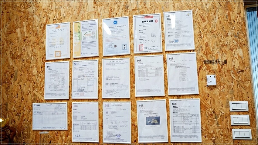 牆壁上展示著檢驗合格證書、SGS合格證書、無毒證明等等