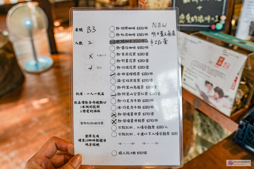 菜單有咖啡、茶等等,飲品都有含米鬆餅,鹹食則是有飯糰,每人低消一杯飲品,價位落在$280~$580之間,入園參觀費也是$280,酌收10%服務費