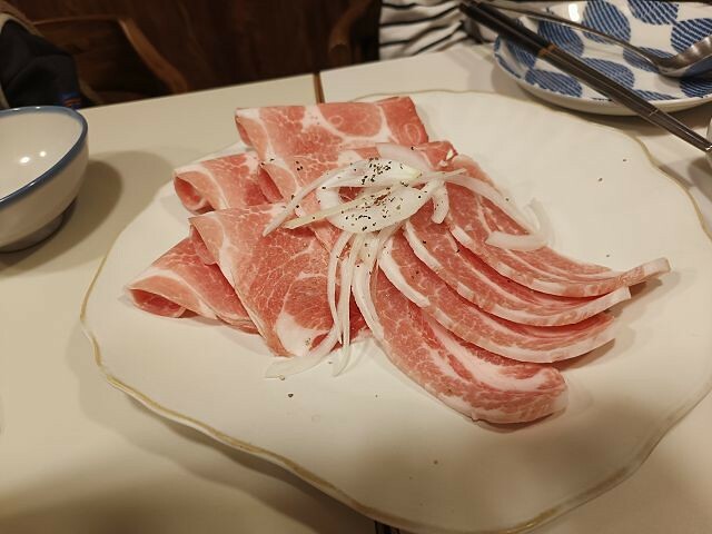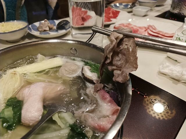 「來初鍋物」的肉品都是現切的,無論是牛肉、豬肉、櫻桃鴨,肉片切的厚度實在,份量也足,該有的油花分布也均勻,看得出是新鮮的肉品。