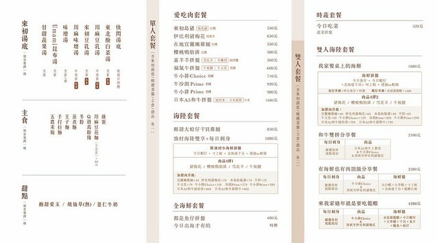 最後來分享「來初鍋物」的菜單,雖然價格為中高價位,但能在百年古宅裡,享用高質感的鍋物美味,還是滿值得的呢!