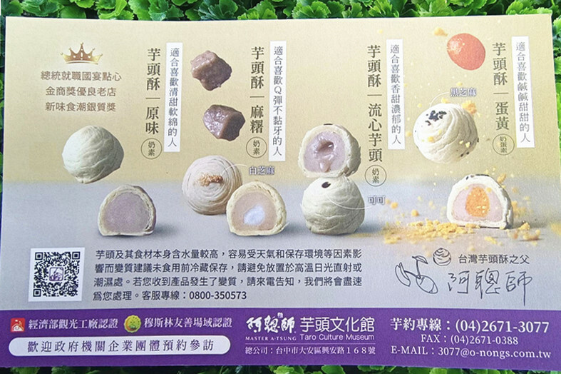 禮盒內還有這張不同口味芋頭酥的介紹,包括原味芋頭酥、流心芋頭酥、麻糬芋頭酥和蛋黃芋頭酥等,個種口味應該都有不同擁護者,芋頭控的我倒是都想吃吃看