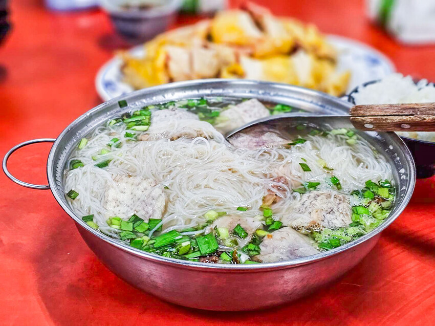 芋頭米粉湯是另一款人氣必點的招牌菜。芋頭本身質地鬆軟,帶有自然的甜味。湯頭融合了韮菜的香氣,而米粉本身滑溜且嚼勁十足,能很好地吸附湯汁的風味,吃不完打包回家也不會難吃