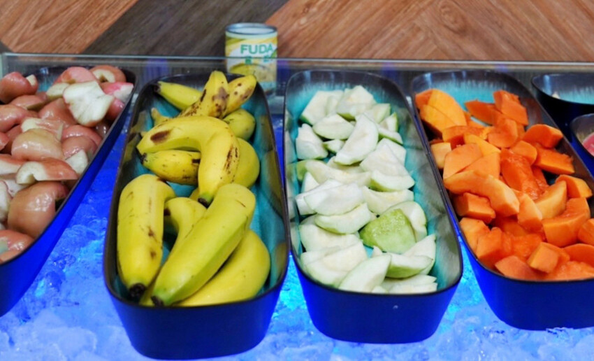 時令水果區有10多種!番茄、哈密瓜、鳳梨、木瓜、柳丁、芭樂、香蕉…等。