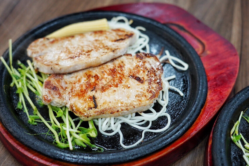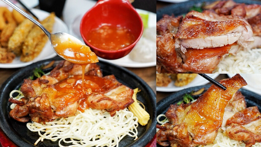 如果你很會吃可加點雞腿排!剛上桌雞腿排還很燙口,外皮很酥脆,雞腿肉質挺軟嫩,吃得到鐵盤烤香味~